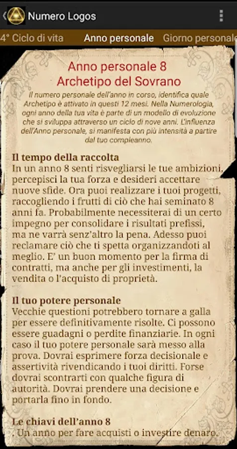 • Personal year number - The personal number of the current year identifies the Archetype that is activated during these 12 month. In Numerology, every year of your life is part of a model of evolution that develops over a cycle of nine years.