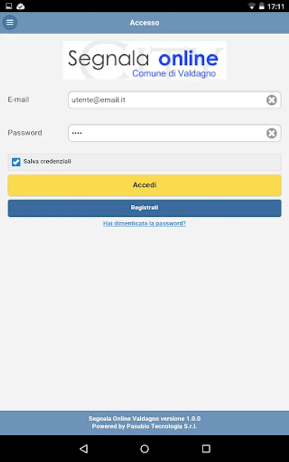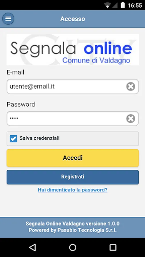 To use the app you must be registered on SegnalaOnLine Valdagno or register through the app itself.