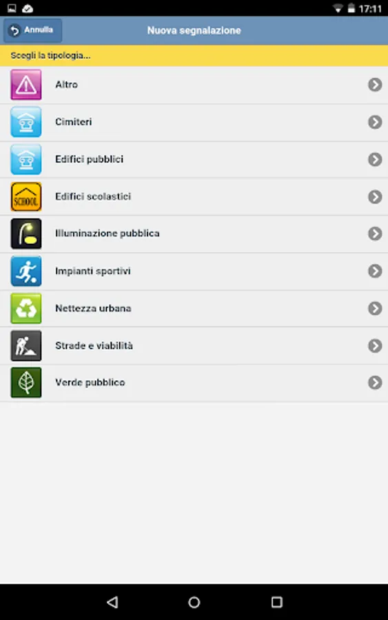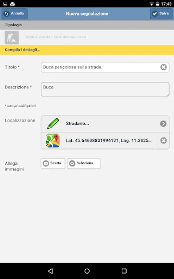 The App allows you to enter, and subsequently monitor, reports regarding outages throughout the municipality of Valdagno: for example you can report a street light not working, a hole in the road, carelessness in green areas, etc.
