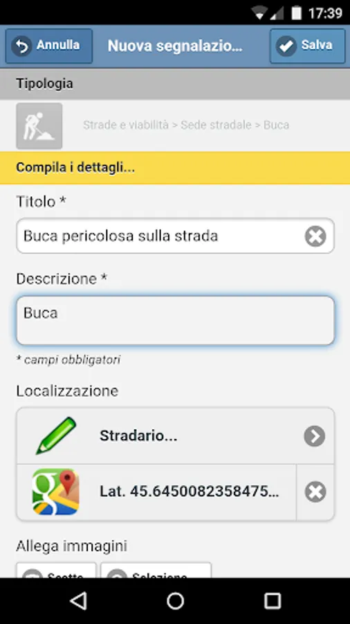 For each message you must provide the type, title and description, and, optionally, you can locate the problem (with street or geolocation via GPS) and attach photos.