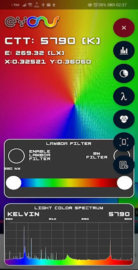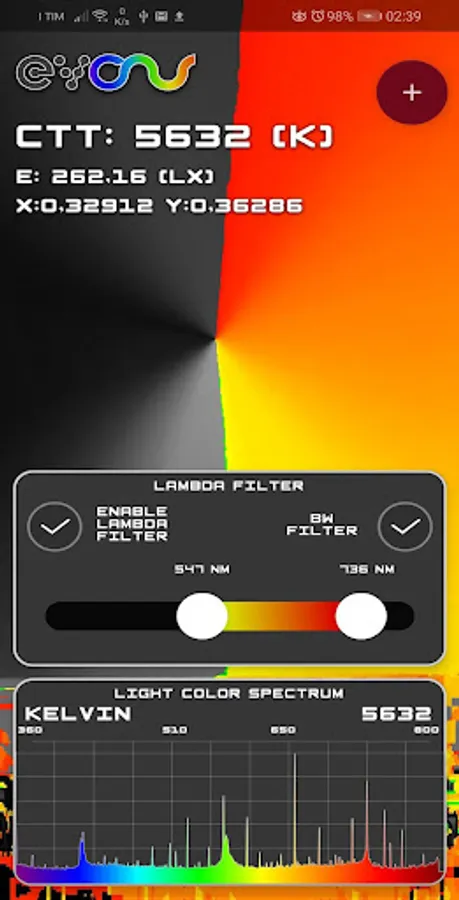 With LightSpectrumPro EVO you can measure the color temperature of a light source without having to spend hundreds of dollars on professional devices. LightSpectrumPro EVO has an error of 2 - 8% compared to existing professional products on the market. in addition to the color temperature measurement in Kelvin, LightSpectrumPro EVO allows you to view the color spectrum of the light being examined with a band ranging from 360nm to 800nm. in addition to the spectrum it is possible to display the position of the white point on the CIE 1931 diagram and to apply a filter for wavelengths to display in overlay on the image captured by the cameras which elements reflect a specific frequency and with what intensity.
