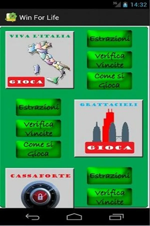 You never know what numbers to play? Still undecided whether to see the face, reliance on dreams or complicated mathematical calculations? What today via Fortuna Premium, you will always have the ability to generate your combinations, and save them in your device, so you can groped luck in the Win For Life in its three variants (Long live Italy, which is equal to Classic version of the game - Safe - Skyscrapers), 10 and Lotto, and SuperEnalotto! All this in a simple and fun