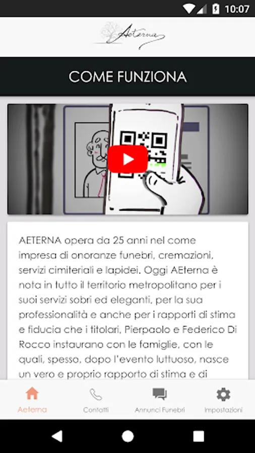 AETERNA has been operating for 25 years as a company of funeral parlors, cremations, cemetery and stone services. Today AEterna is known throughout the metropolitan area for its sober and elegant services, for its professionalism and also for the relationships of esteem and trust that the owners, Pierpaolo and Federico Di Rocco establish with the families, with whom, often, after the mournful event, a true relationship of esteem and friendship is born.