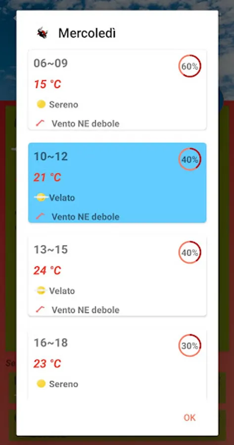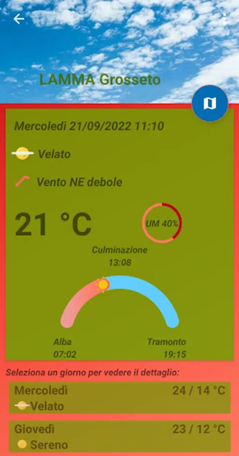 By clicking on the button depicting the map, it is possible to select the municipality for which it is possible to view the relative weather forecasts.