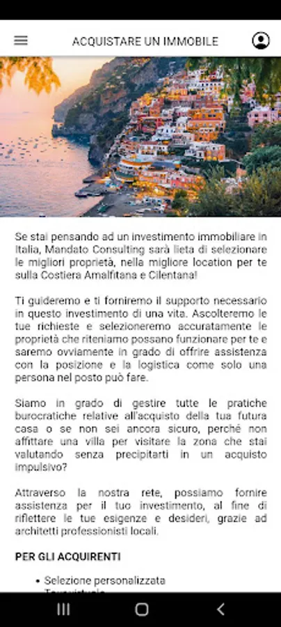 Through the Mandato Consulting App, foreign visitors, tourists and citizens will be able to take advantage not only of the services indicated but also have a key at hand to discover the beauties of the Amalfi and Cilento Coast, its flavors and its facilities.