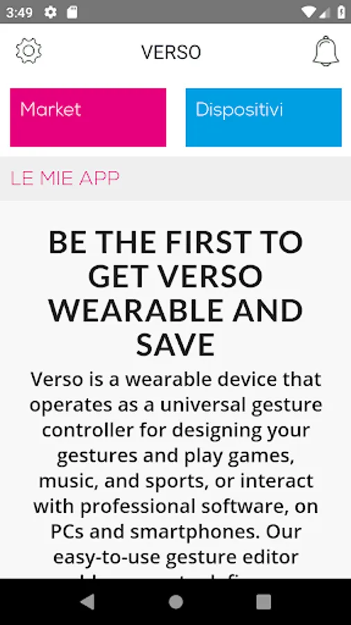 The company has designed and patented Verso ONE, Verso is a wearable device that works as a controller of universal gestures to design gestures and games, music and sports, or interact with professional software, on PCs and smartphones. Our easy-to-use gesture editor allows users to define new gestures, customize interaction and design new ways to interact with their favorite apps. Furthermore, new gestures or applications based on gestures can be uploaded to our marketplace and shared with other users.