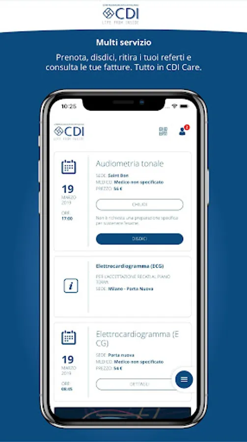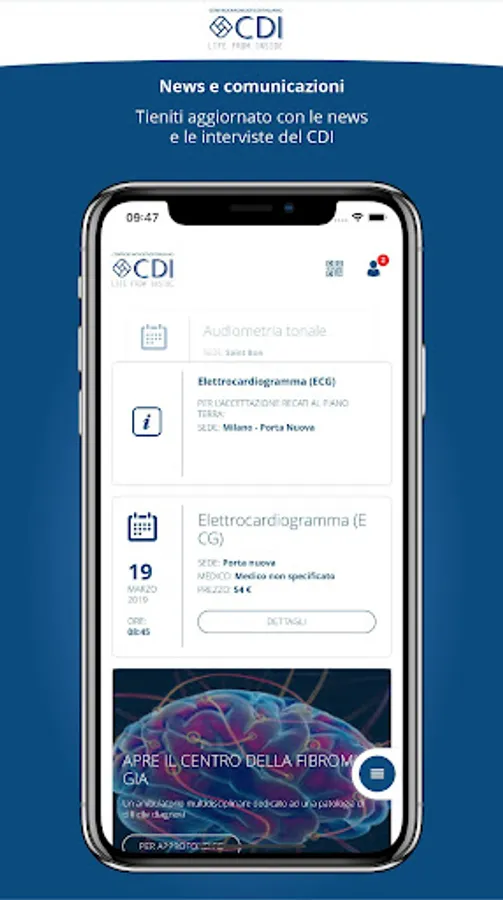Bookings: in the online booking section you can select available seat, doctor and type of visit, you can view active bookings and cancel. A few days after the visit you will receive notifications with the appointment reminder and the documentation to be presented.