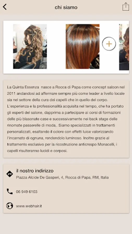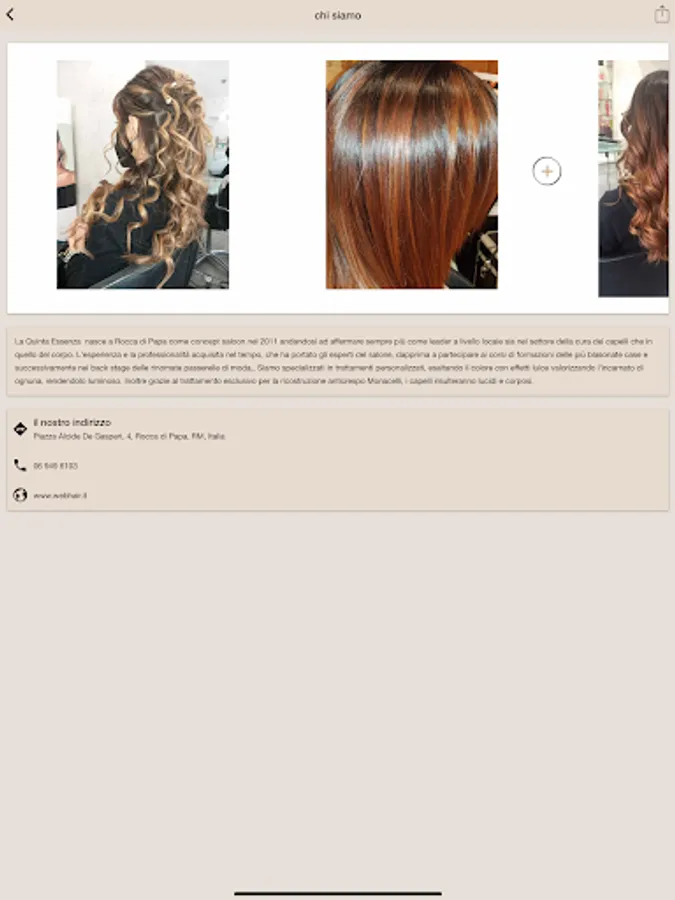 La Quinta Essenza was born in Rocca di Papa as a concept saloon in 2011, establishing itself more and more as a local leader in the hair care sector. We specialize in personalized treatments, enhancing the color with light effects, enhancing the complexion of each, making it luminous. Furthermore, thanks to the exclusive Monacelli anti-frizz reconstruction treatment, the hair will be shiny and full-bodied. In order to get our seriousness and professionalism to our customers, always keeping up with the times, as a better tool than an application for mobile devices, where through push notifications we can communicate our events, promotions, news and much more. We have included fun functions in the app such as the scratch card with small discounts, we have inserted the loyalty card., As the best tool to retain and reward our customers. While with the invite a friend function there are many discounts and points for both. We have tried to create a dynamic app by creating constant and daily interest.