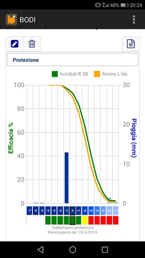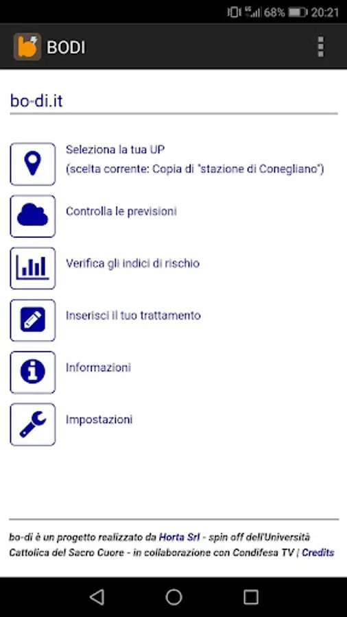 BoDi is an innovative, simple and flexible tool that informs on the agrometeorological conditions of its range, on the potential development of the main adversities and on the dynamics of protection of a phytosanitary treatment.