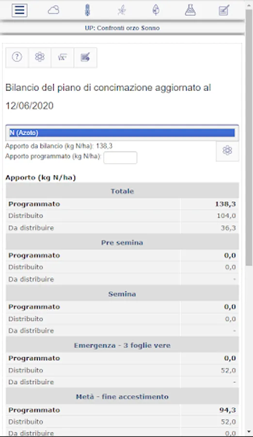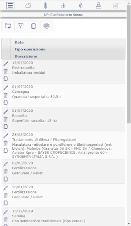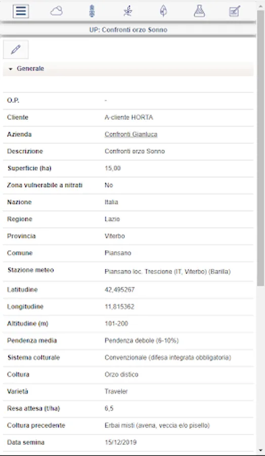 The following macro-functions are enabled: consultation and modification of company master data, creation and modification of attributes of production units and records relating to cultivation operations, as well as consultation of meteorological data, phenological model, risk indexes relating to fungal diseases and the advice relating to nitrogen fertilization.
