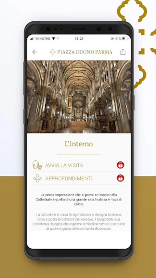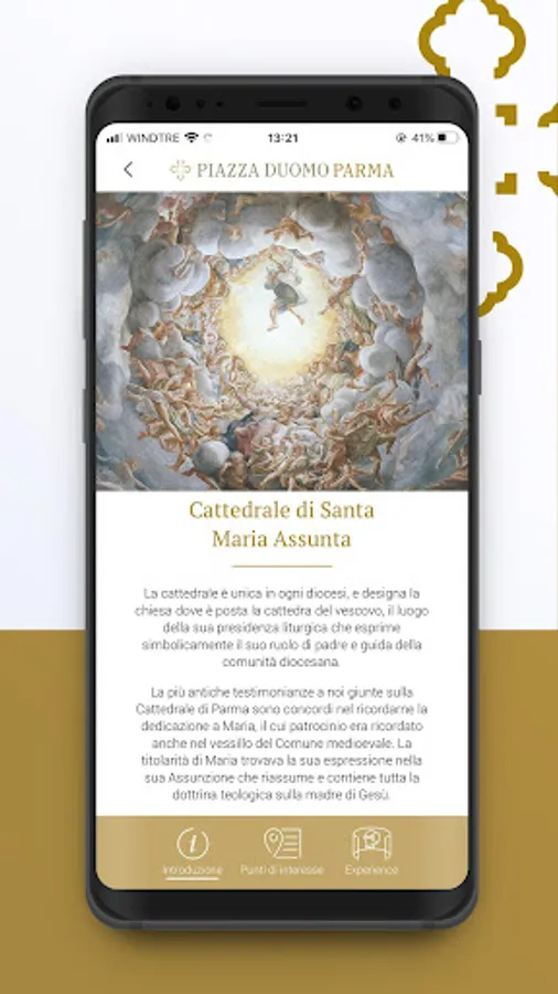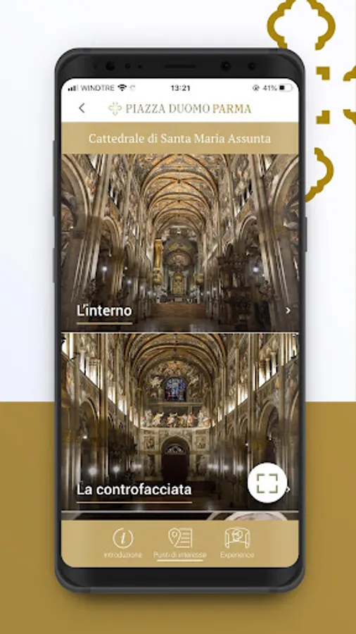 The monumental complex of Piazza Duomo in Parma hosts some of the most important monuments of Italian sacred art, such as the Cathedral of Santa Maria Assunta, the Baptistery of San Giovanni Battista. The Piazza Duomo Parma app is a journey through the wonders of this square: once on site, you can access additional content that guides you during the visit in an engaging and simple way to follow.