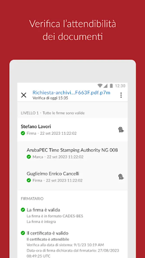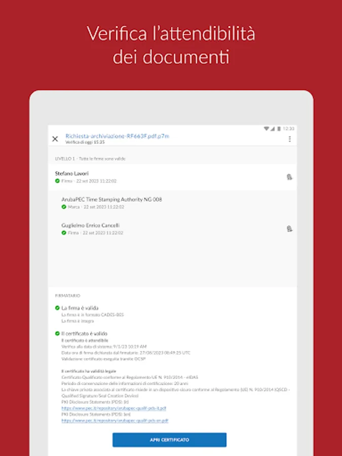 Digital Signature Aruba is Aruba's app to use Remote Digital Signature and Time Brands on smartphones and tablets. Allows the qualified signature and time stamp of documents according to current Italian legislation. The Software also allows the verification of digitally signed and / or time stamped documents.