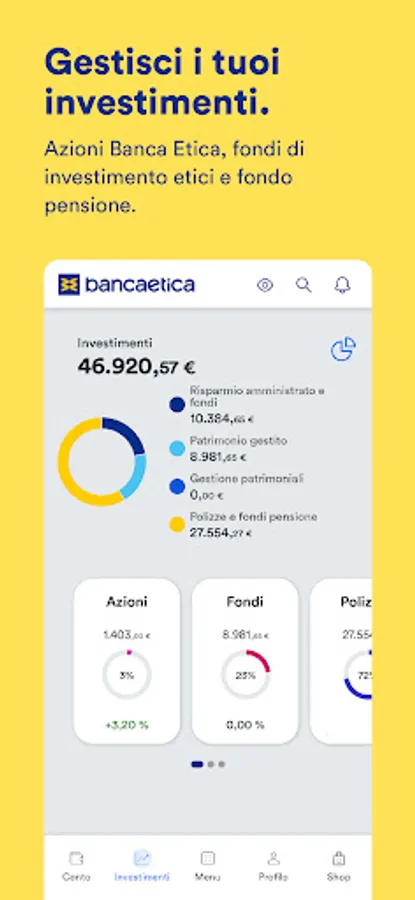 Manage your investments: Banca Etica shares and bonds, ethical investment funds, Italian government bonds, pension funds.