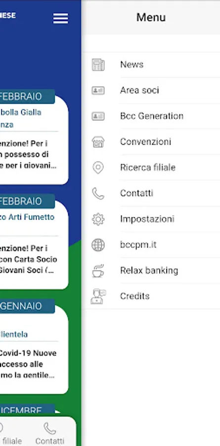 With Bcc PM you can view all the latest news and receive a notification when new updates are published, access the reserved area where you can download your digital membership card, find more easily all the agreements in the area and search through an interactive geographical map , all branches or ATMs closest to where you are.