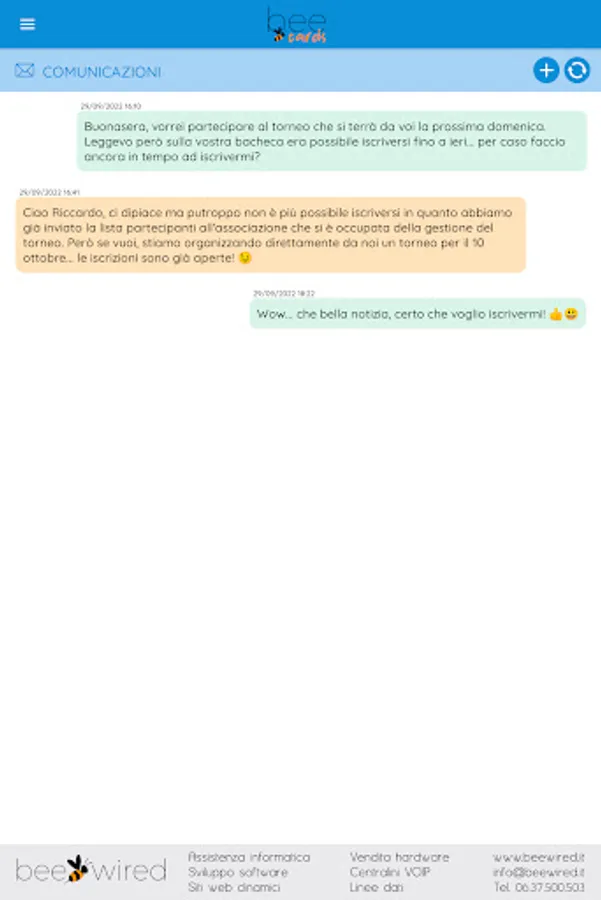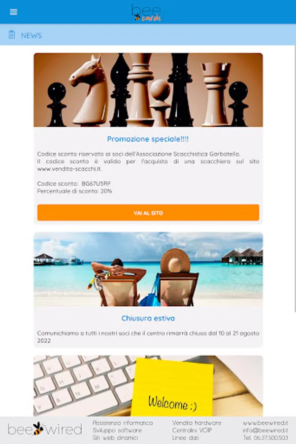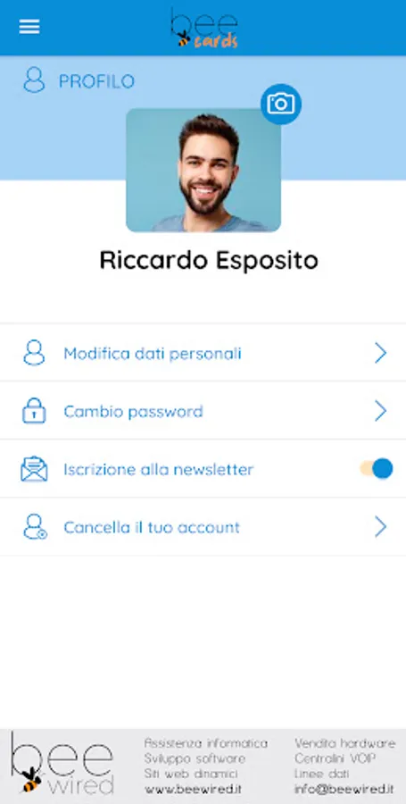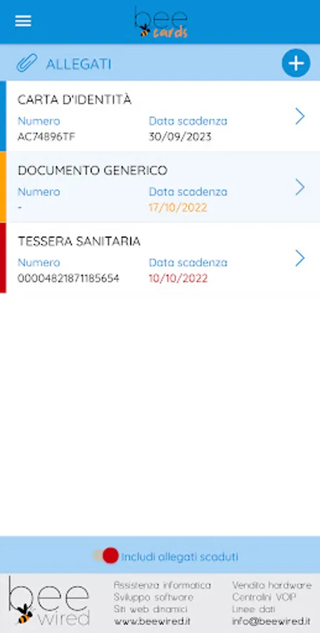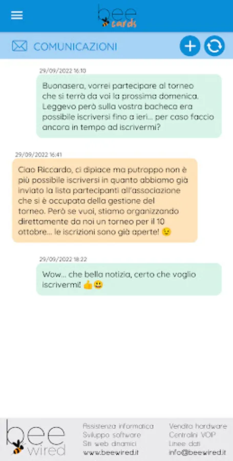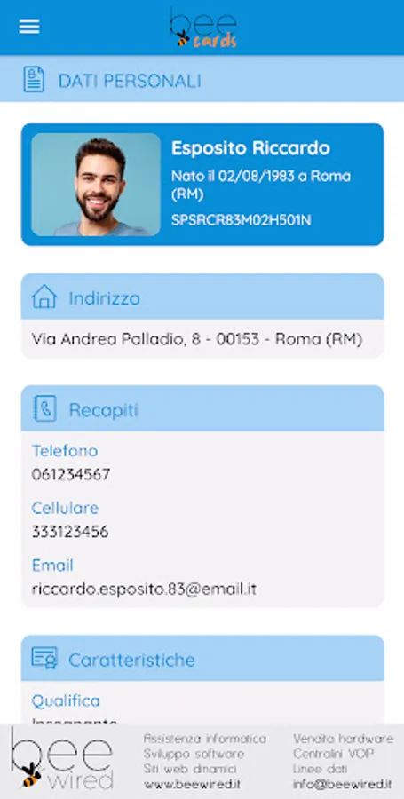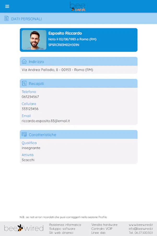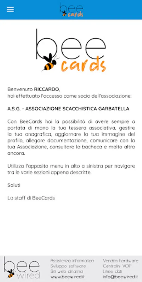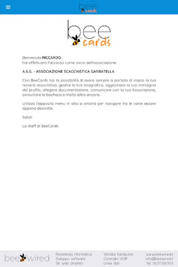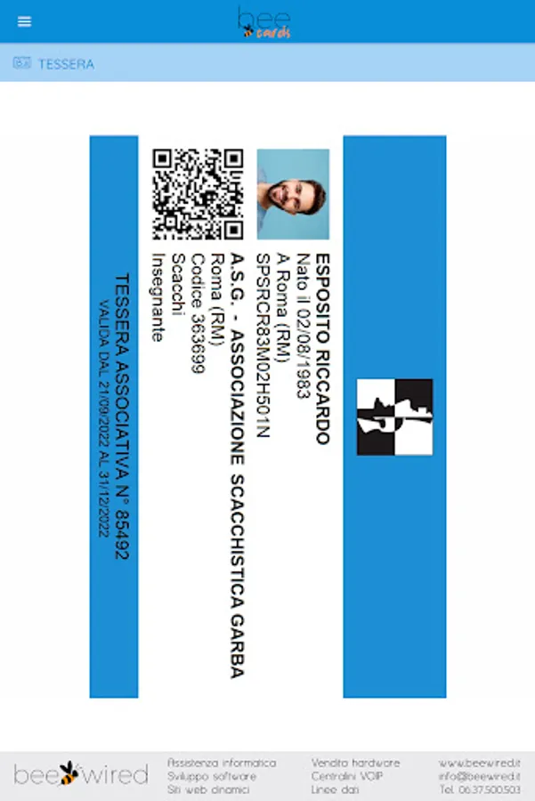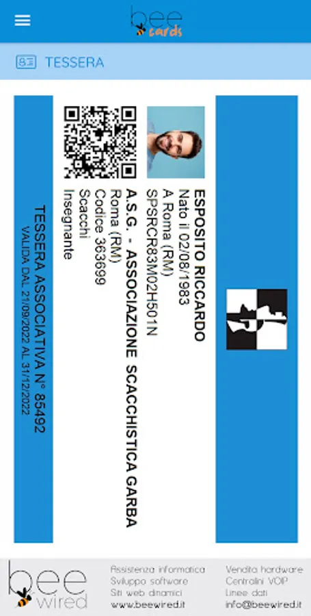 The BeeCards application was created and designed for the members of the Associations registered with BeeCards and is reserved for them, allowing them to always have their membership card at hand, to update their personal data and profile photo, to send to their Association with all the necessary documentation (identity documents, certificates, licenses, etc.), to communicate directly with your Association, to be always updated on the news proposed by your Association and much more.