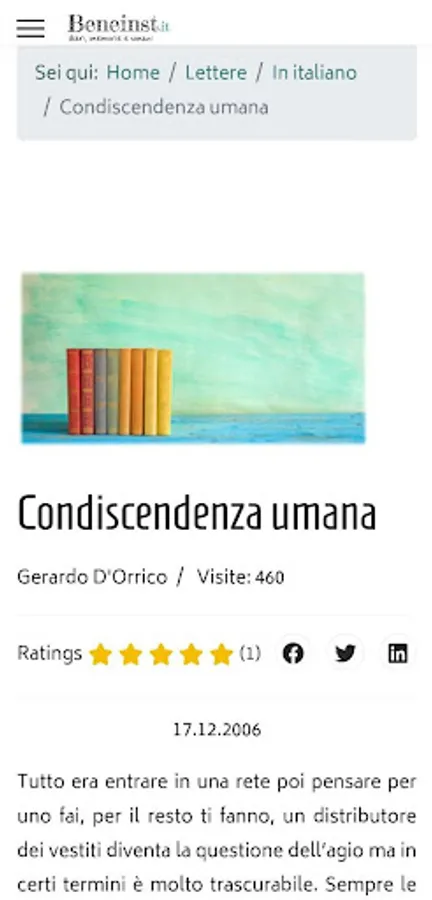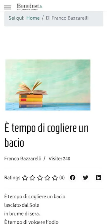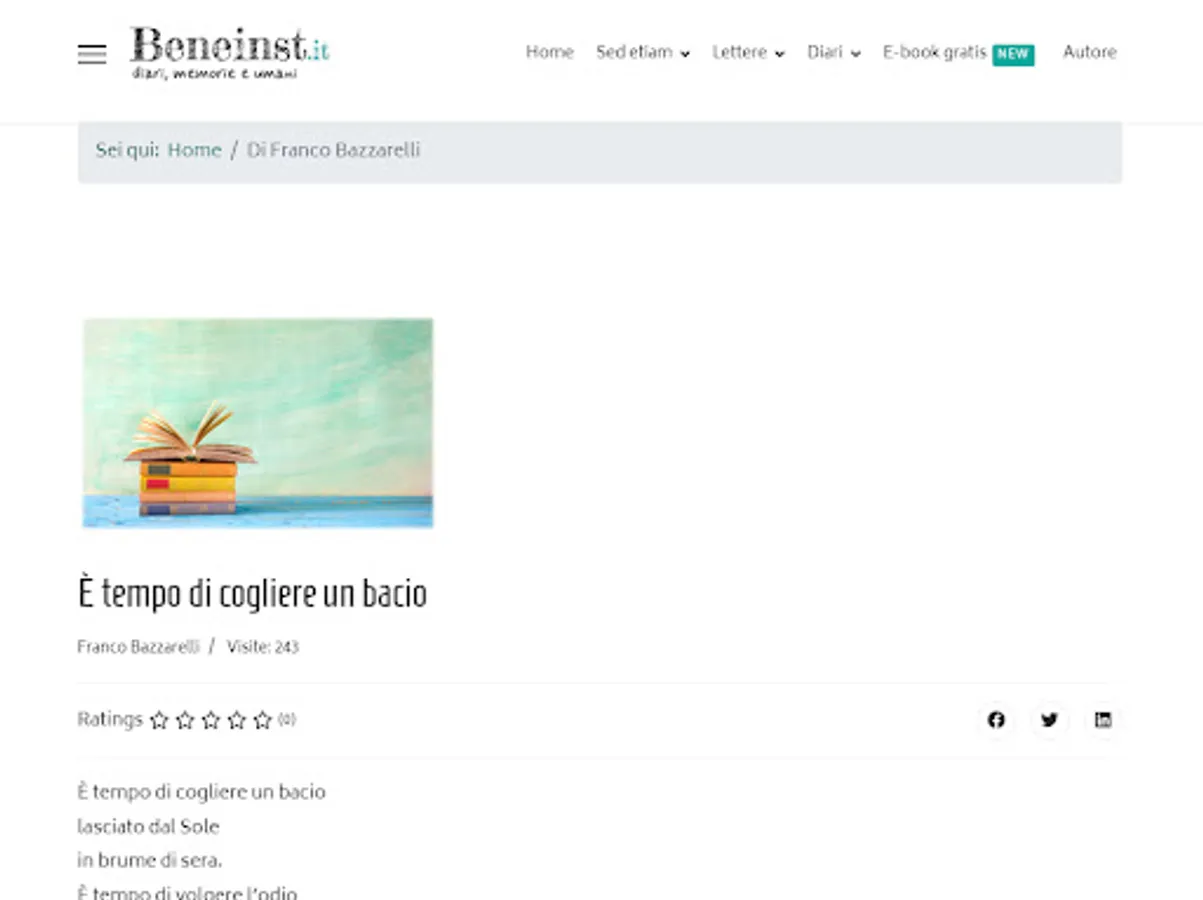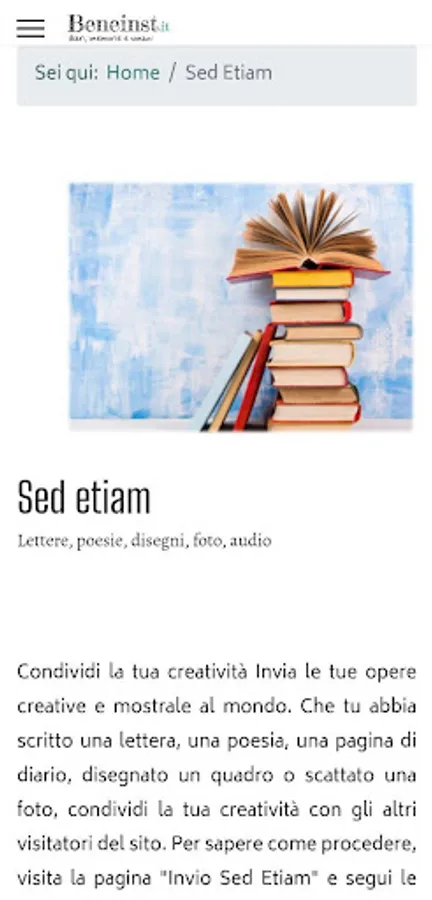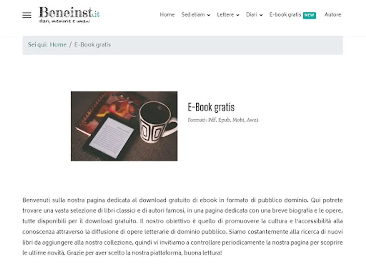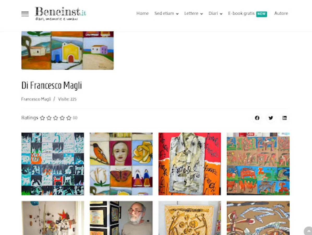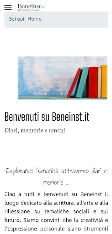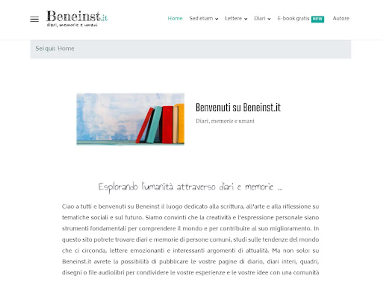 On this site you will find diaries and memoirs of ordinary people, studies on trends in the world around us, exciting letters and interesting current topics. But that's not all: on Beneinst.it you will also have the opportunity to share your experiences and ideas by publishing your diary pages, complete diaries, paintings, drawings or audiobook files. You will be part of an open and curious community, where every voice, large or small, contributes to constructive dialogue and personal and collective growth.