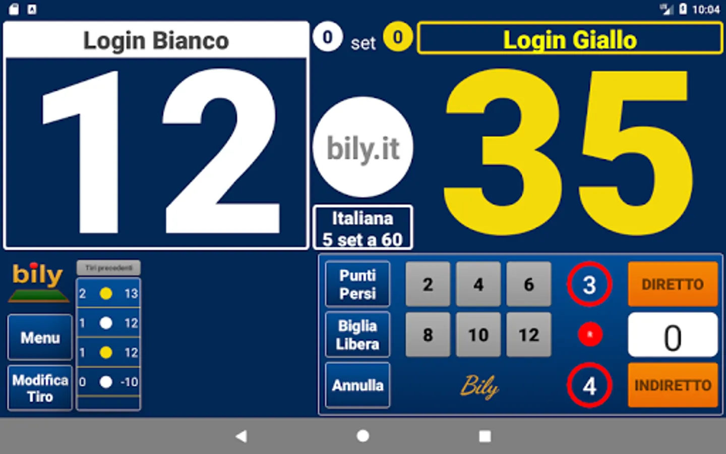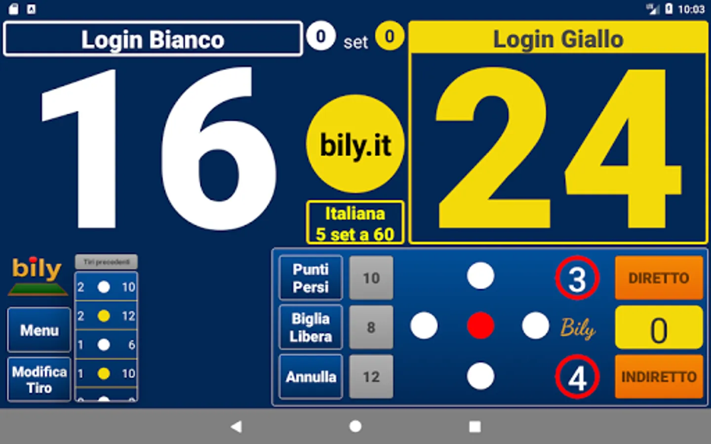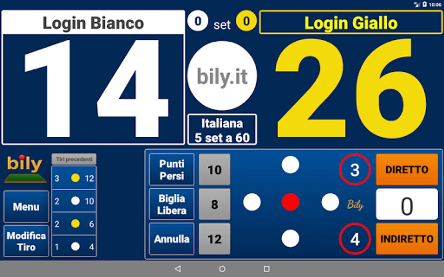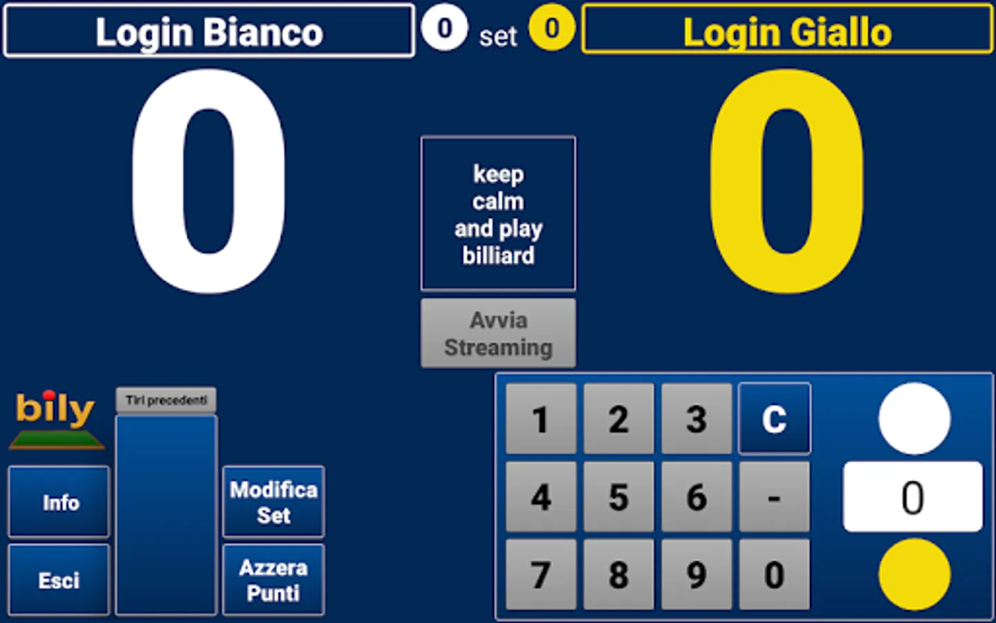 Log in before the start of the match directly by tapping the player's name on the board; set the game by touching the white box in the center of the screen with the description of the game; sets the advantage by touching the score of the player who must receive or grant advantage / handicap, before starting the match. Play and consult your statistics directly from the app by tapping the bily icon on the board and also online at the website www.bily.it by logging into the dedicated page ("statistics") accessible from the site navigation menu.
