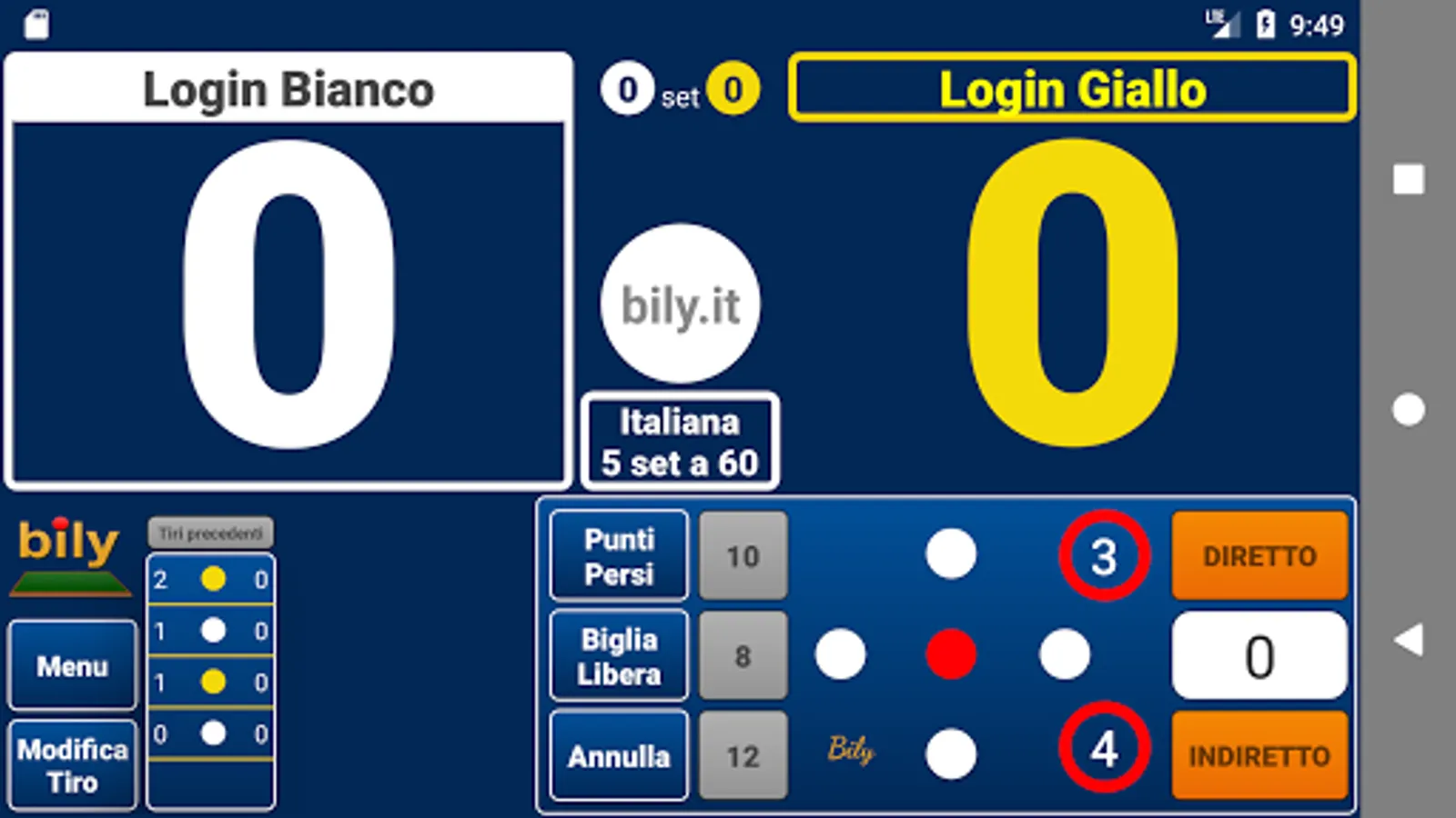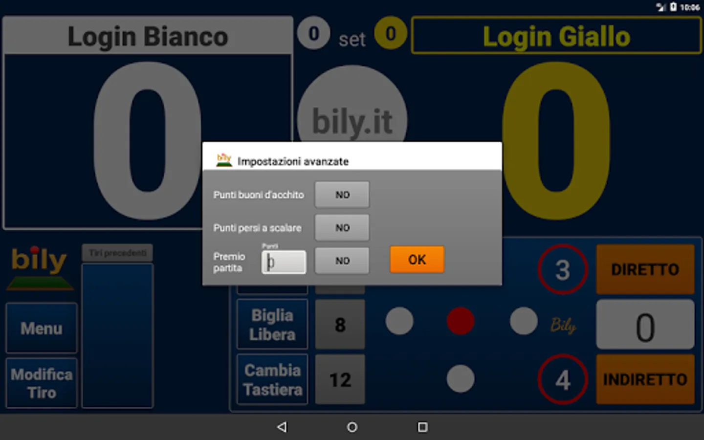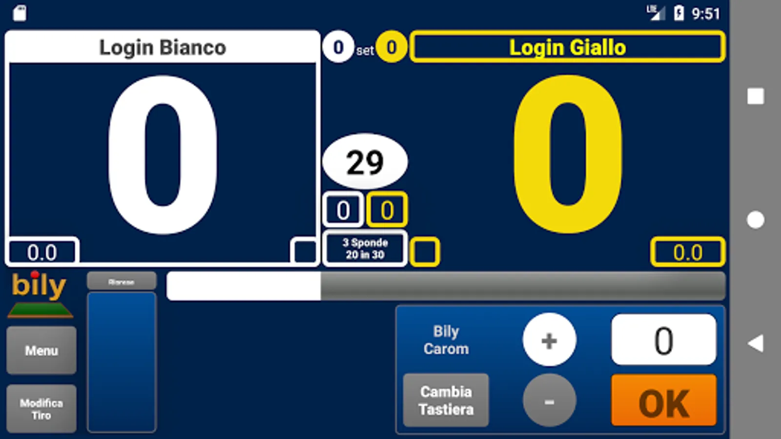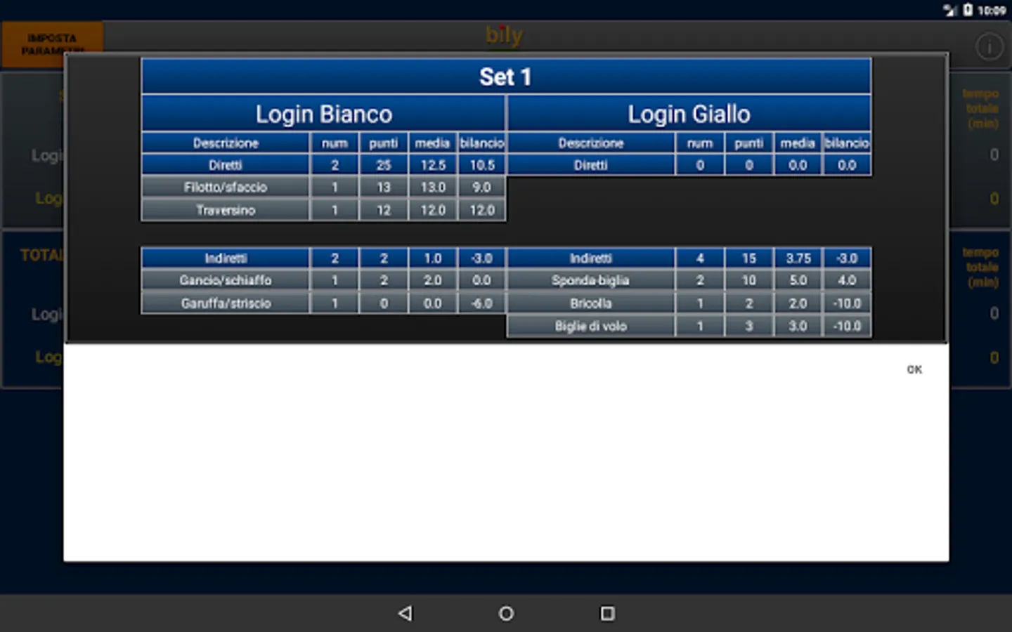 Log in before the start of the match directly by tapping the player's name on the board; set the game by touching the white box in the center of the screen with the description of the game; sets the advantage by touching the score of the player who must receive or grant advantage / handicap, before starting the match. Play and consult your statistics directly from the app by tapping the bily icon on the board and also online at the website www.bily.it by logging into the dedicated page ("statistics") accessible from the site navigation menu.