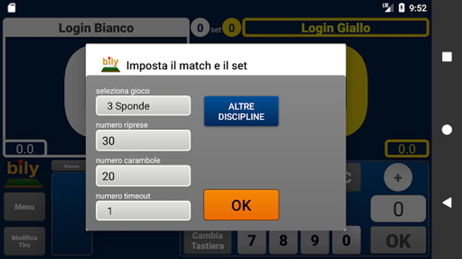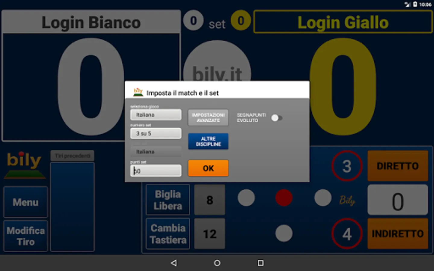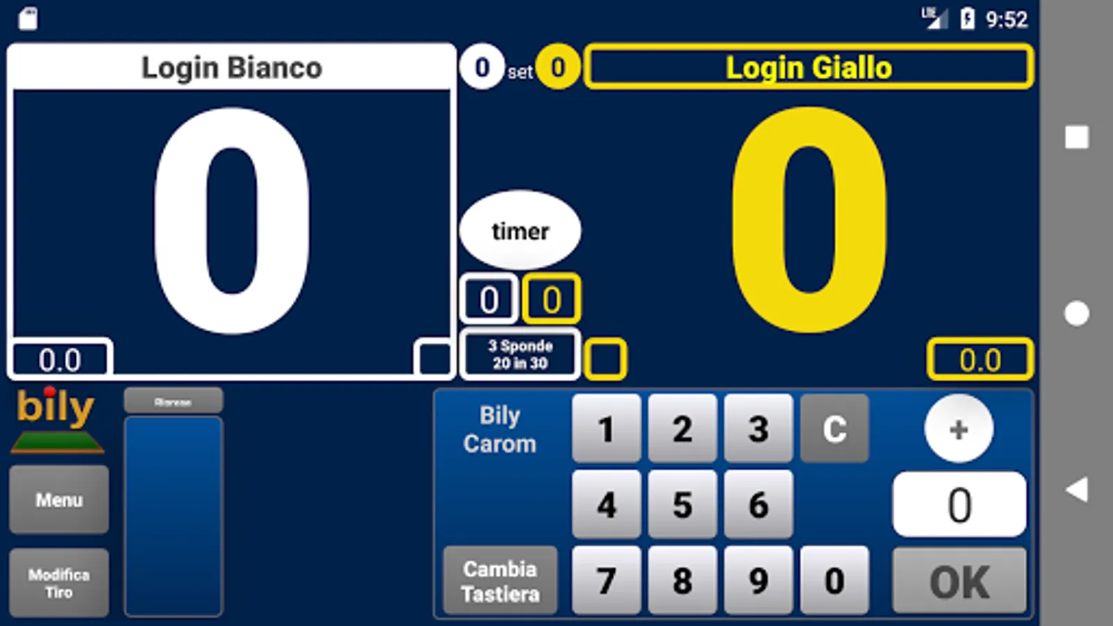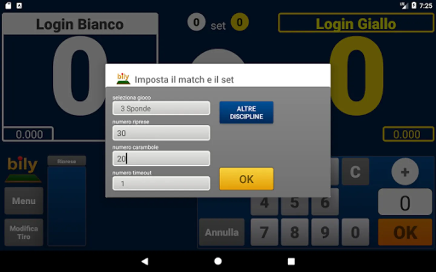 Log in before the start of the match directly by tapping the player's name on the board; set the game by touching the white box in the center of the screen with the description of the game; sets the advantage by touching the score of the player who must receive or grant advantage / handicap, before starting the match. Play and consult your statistics directly from the app by tapping the bily icon on the board and also online at the website www.bily.it by logging into the dedicated page ("statistics") accessible from the site navigation menu.