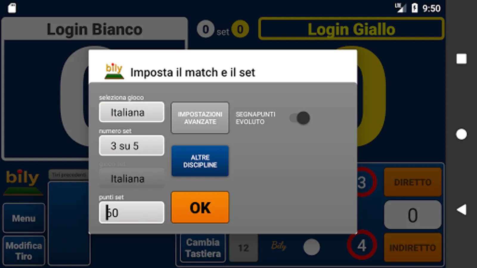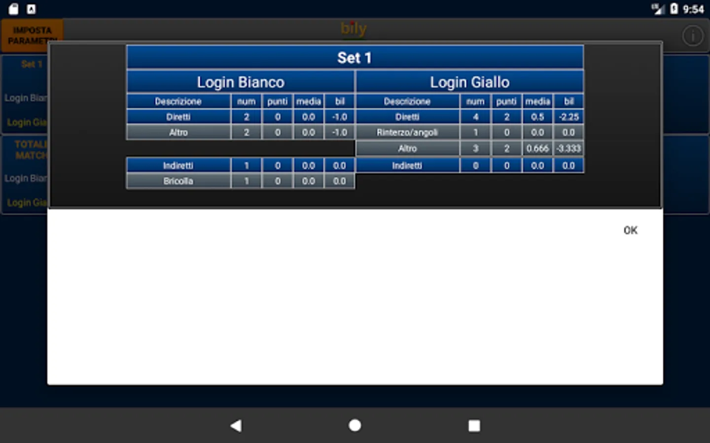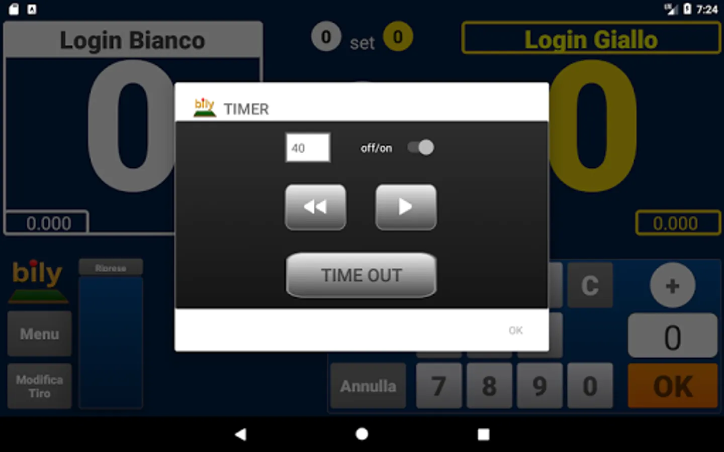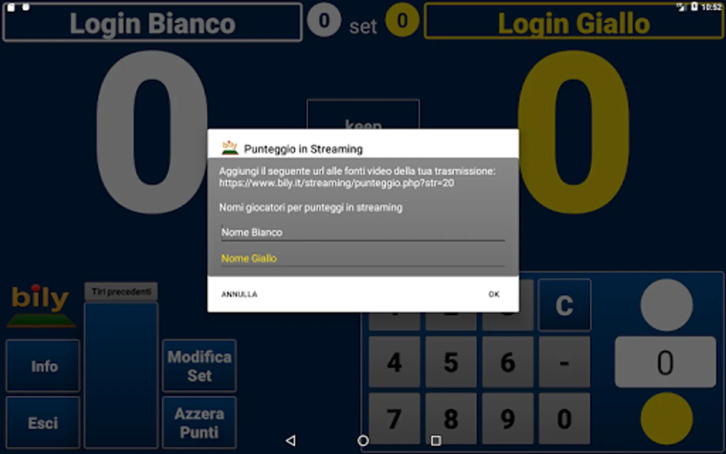 Log in before the start of the match directly by tapping the player's name on the board; set the game by touching the white box in the center of the screen with the description of the game; sets the advantage by touching the score of the player who must receive or grant advantage / handicap, before starting the match. Play and consult your statistics directly from the app by tapping the bily icon on the board and also online at the website www.bily.it by logging into the dedicated page ("statistics") accessible from the site navigation menu.