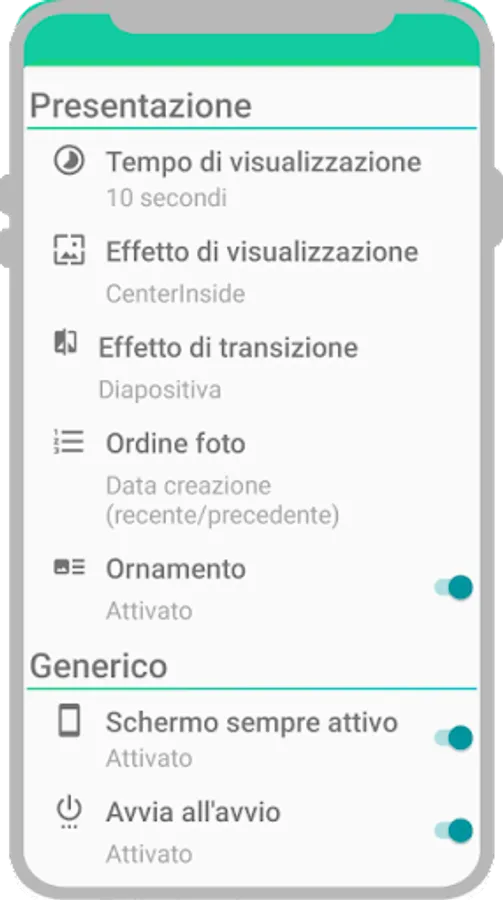 Once you have created your personal gallery within the application you can start the presentation of your photos. You will have the option to choose from various photo slideshow effects, to choose from whether to see the time and date on the device.