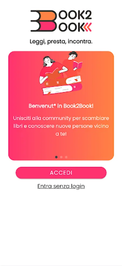 Book2Book (B2B) is a project of proximity and exchange that focuses on people, books and places of social and cultural aggregation, starting from the city of Turin. Its first implementation is this application, aimed at facilitating meetings between people in the same geographical area. In this way, with the B2B platform, the first proximity library in Italy (and beyond) was born. The proximity library exists by sharing the personal books of both individuals and associations and groups in the area. Book2Book thus generates a database of books in the city which is made available to the community itself. The project relies on a network of entities in the area (BookPoint) that have chosen to join this initiative, promoting and making meeting and exchange between people safe. Book2Book was created with the contribution of the Compagnia di San Paolo Foundation