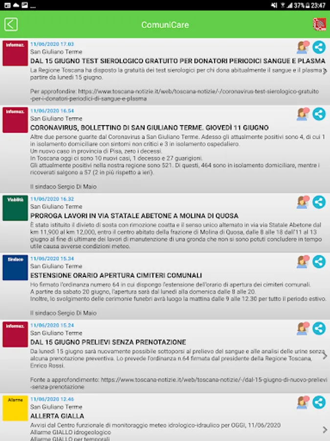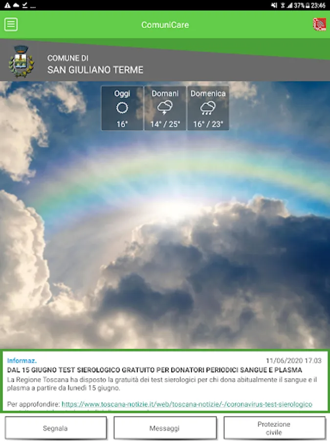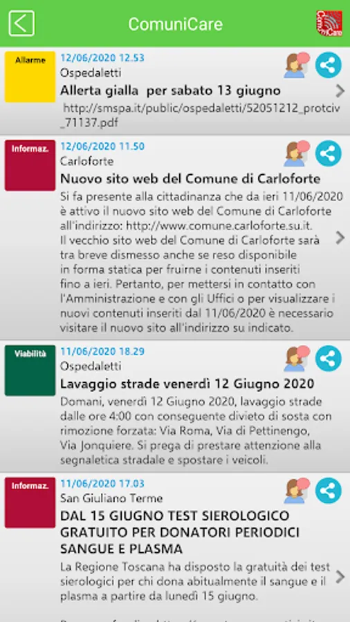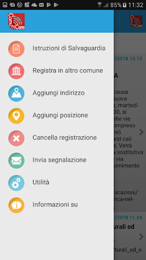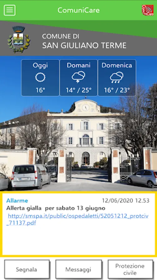 ComuniCare allows you to receive alarm messages and / or information from municipal administrations that use the SMSPA application of the Information Systems and to which you have registered. The messages can be the alarms of the Civil Protection, but also other useful information that the Municipality wants to send to its citizens. ComuniCare also allows citizens to send messages to the Municipality.