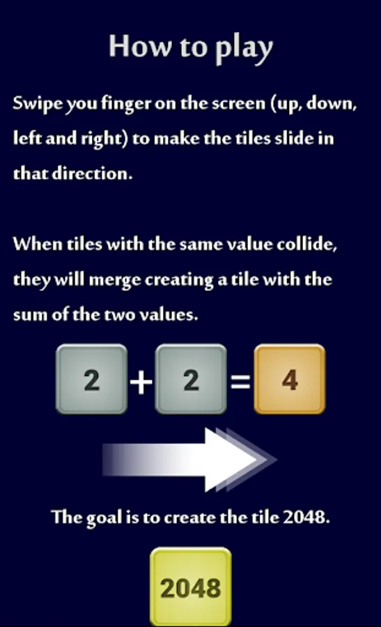 Slide the tiles to sum them, the goal is to create the tile 2048.