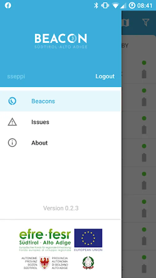 The Beacon South Tyrol Admin is the Beacon Netwok Managemen app that allows the user to view the beacon position, check the beacon status, generate collect and manage issues, change beacon configuration and transmit the configuration (communiction frequency, range, UID, Major, Minor, eddystone URl, etc.) on the single beacons installed within the Beacon South Tyrol Project.