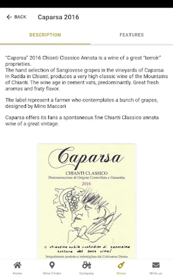Caparsa App has a main page where you can choose the country and find restaurants and shops close to you that sell Caparsa's wines. Or with a simple word you can search for a specific place.