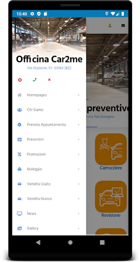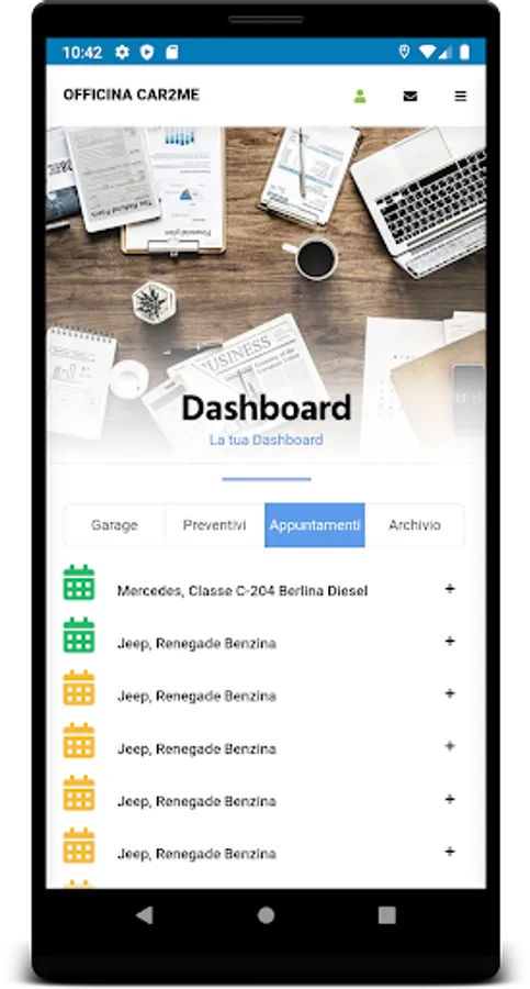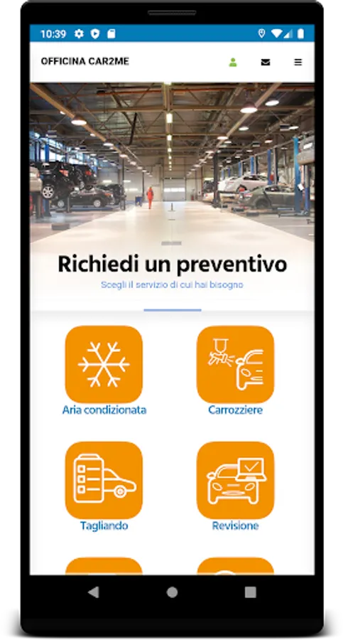 The Offic2 Car2me App reminds you of your car's deadlines such as insurance, stamp duty and overhaul. Through the appropriate sections you can book an appointment or request a quote if you need mechanical, electrical, cutting, bodywork, directly proposing an appointment date to your trusted workshop; you can also consult the active promotions and book an appointment at the most convenient price.