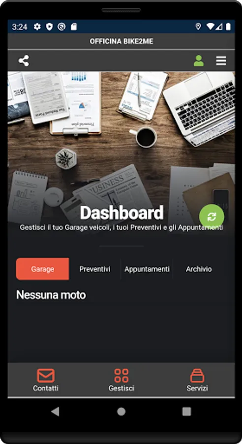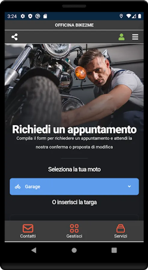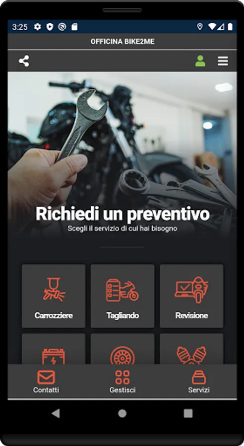 The Bike2me Workshop App reminds you of the deadlines of your bike such as insurance, road tax and overhaul. Through the appropriate sections you can book an appointment or request a quote if you need mechanical, electromoto, service, bodywork, directly proposing an appointment date to your trusted workshop; you can also consult the active promotions and book an appointment at the most convenient price.