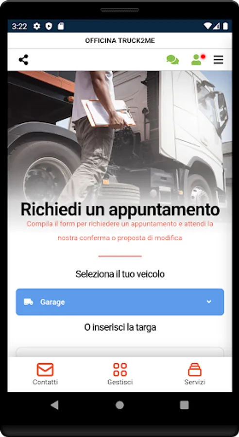 Through the Truck2me Workshop App, a demo app specially structured to let you touch our App service dedicated to professionals in the Cargo world, you can book an appointment or request a quote, directly proposing an appointment date to your trusted workshop ; you can also consult the active promotions and book at the most convenient price.