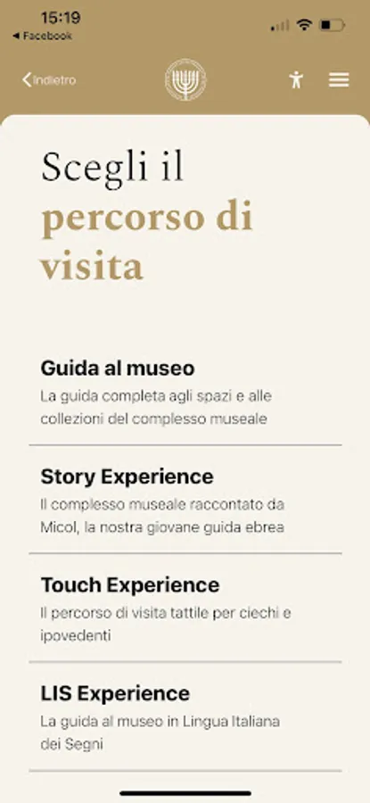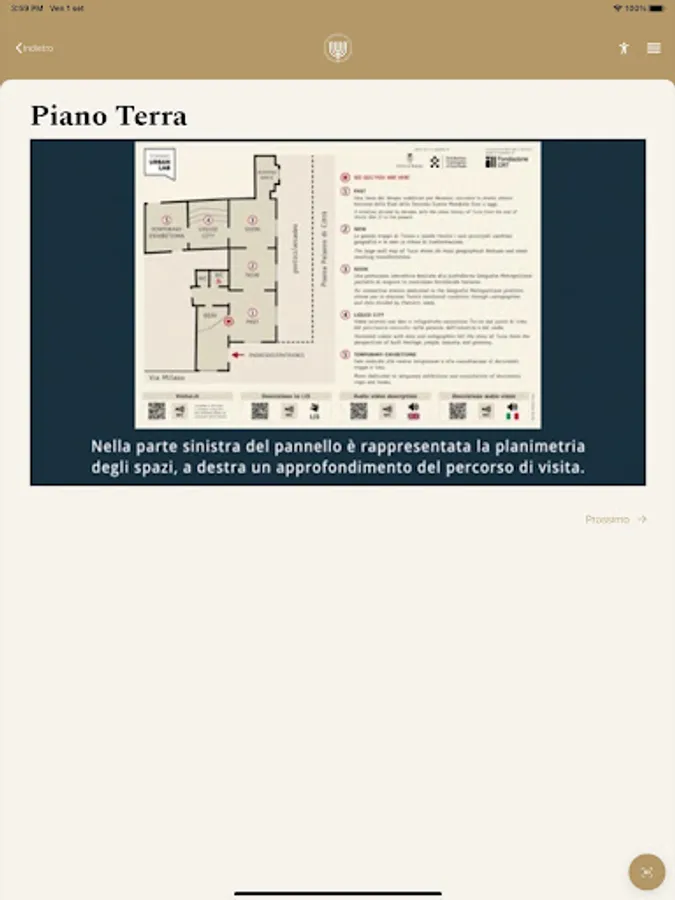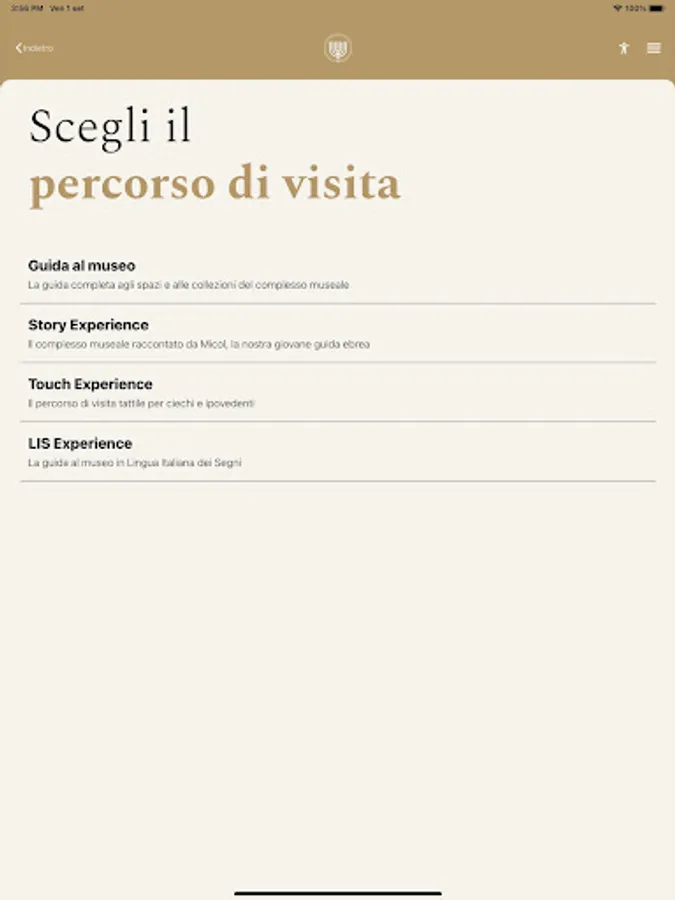 If you are at the Museum, the App offers you four visit itineraries. A guide to the exhibition spaces (GUIDE TO THE MUSEUM), an interactive audio guide (STORY EXPERIENCE) and two itineraries designed for people with sensory disabilities: TOUCH EXPERIENCE, with audio-video descriptions integrated with tactile panels located along the itinerary and LIS EXPERIENCE, with video guides in Italian Sign Language (LIS) and International Sign (IS).
