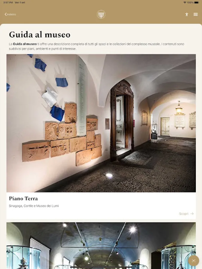 The App is rich in content and can also be used before or after the visit to learn about the history and culture of the Casalese Jews. Watch the Virtual Tour with 360° images of the Museum or consult the Glossary to learn about the words of Jewish tradition and culture.