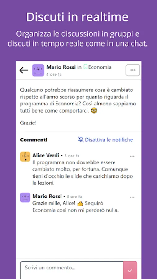 You and your teammates can discuss in an orderly manner and always be informed through notifications. Facebook leaves the comrades of several years isolated in groups, losing track of important information. Whatsapp leads to disordered and overlapping discussions. Cassini is the alternative to all this.