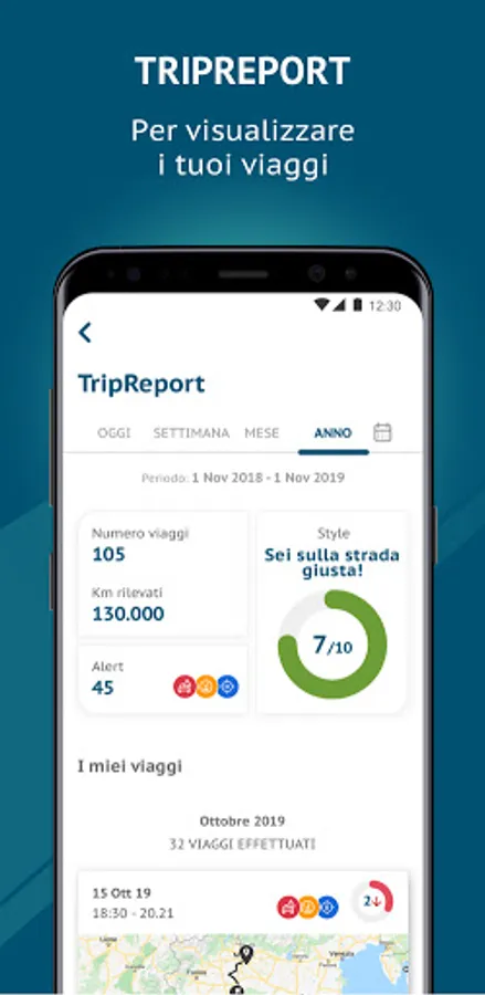 - "TripReport", to display the data of the trips made by retracing the number of journeys, the kilometers travelled, the type of road travelled, the time at which the trip took place and any alerts recorded