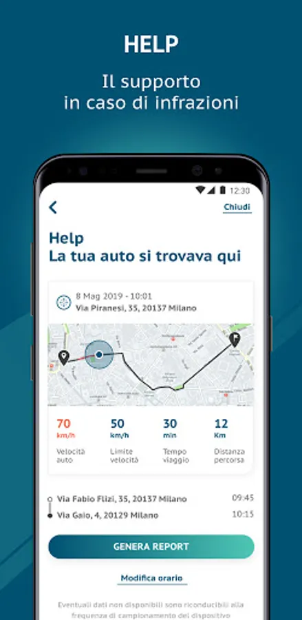 - "Help", through which it is possible to download a report that certifies the exact position of the vehicle at the moment in question in the event of a contravention deemed unjust, verifying the presence of cases of excess speed or no parking