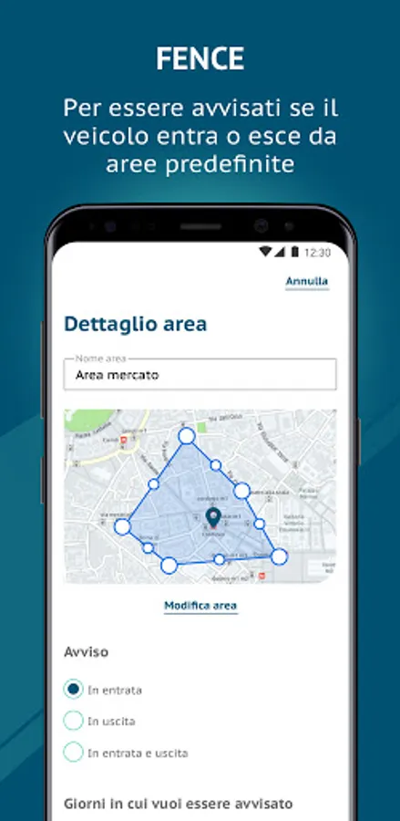 - "Fence", to set up to 3 virtual areas and receive notifications and warnings if the vehicle enters or leaves the pre-set area