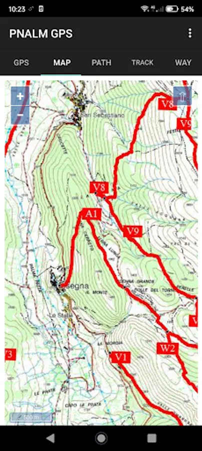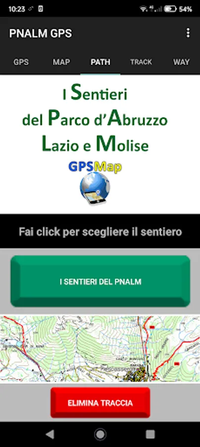 In the app there are all the GPX tracks of the PNALM trails, they can be followed using the GPS of the smartphone on a detailed 1: 25000 offline map. You choose the path to follow and the trace in green color appears on the cartography, your path is recorded with a blue trace that overlaps the green one, in this way it is possible to check if the path is the correct one. There is also a waypoints management and you can send the recorded route in GPX format to any email address.