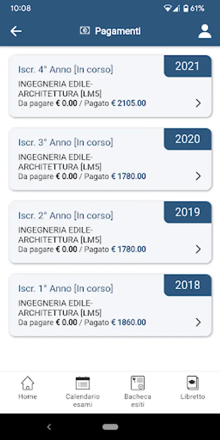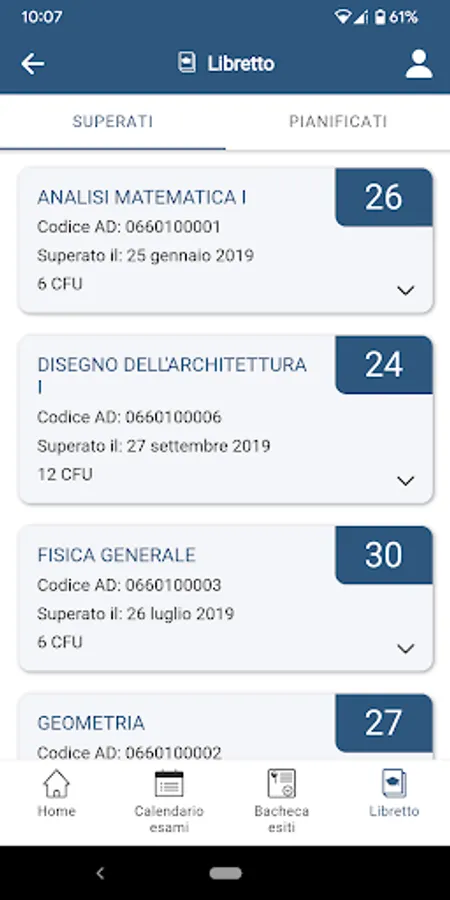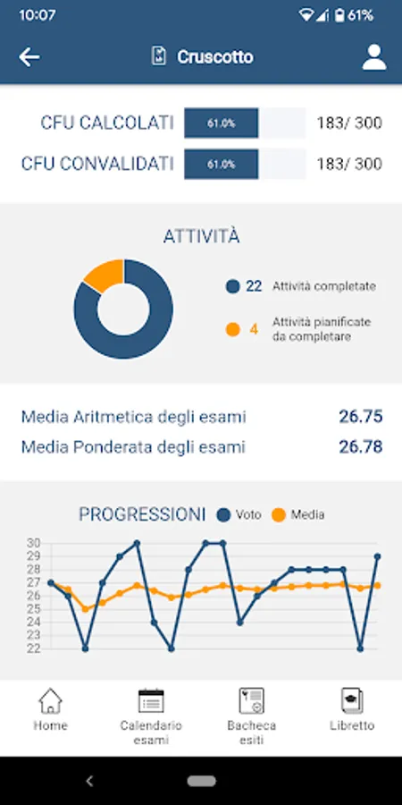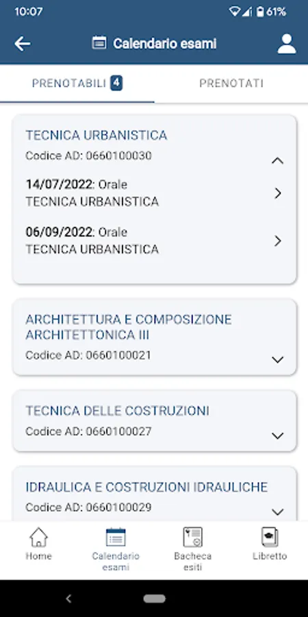 Once logged in, the student will be able to access their profile. Here it will be possible, among other things, to register for an exam, accept the vote, get information about your university career.