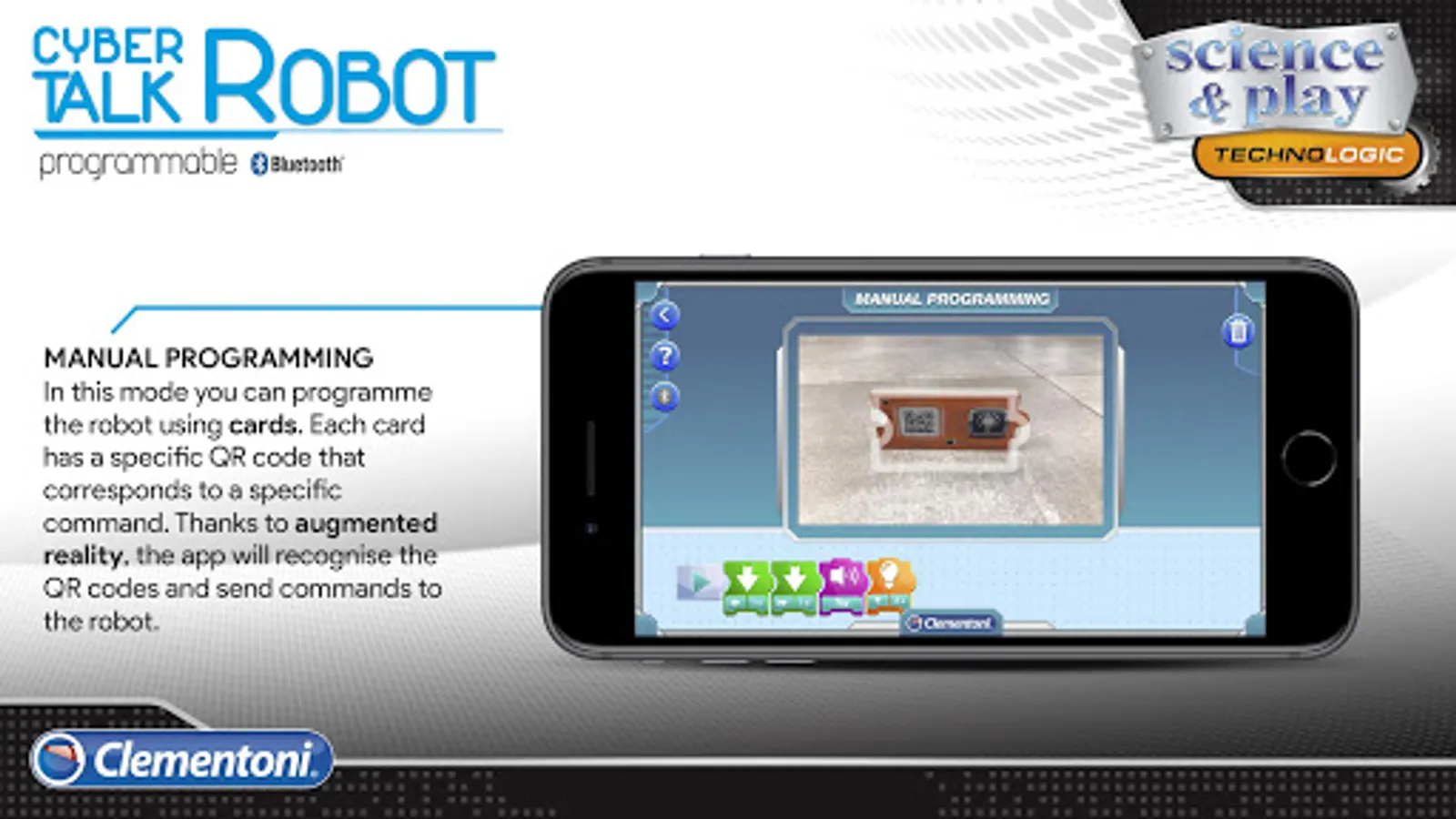 The package includes 16 cards corresponding to 16 commands, each with a different QR Code. After the command sequences have been created by manually arranging the cards side-by-side, thanks to augmented reality, the app will be able to read all the codes and recreate the sequence digitally, before sending it to the robot for its execution.