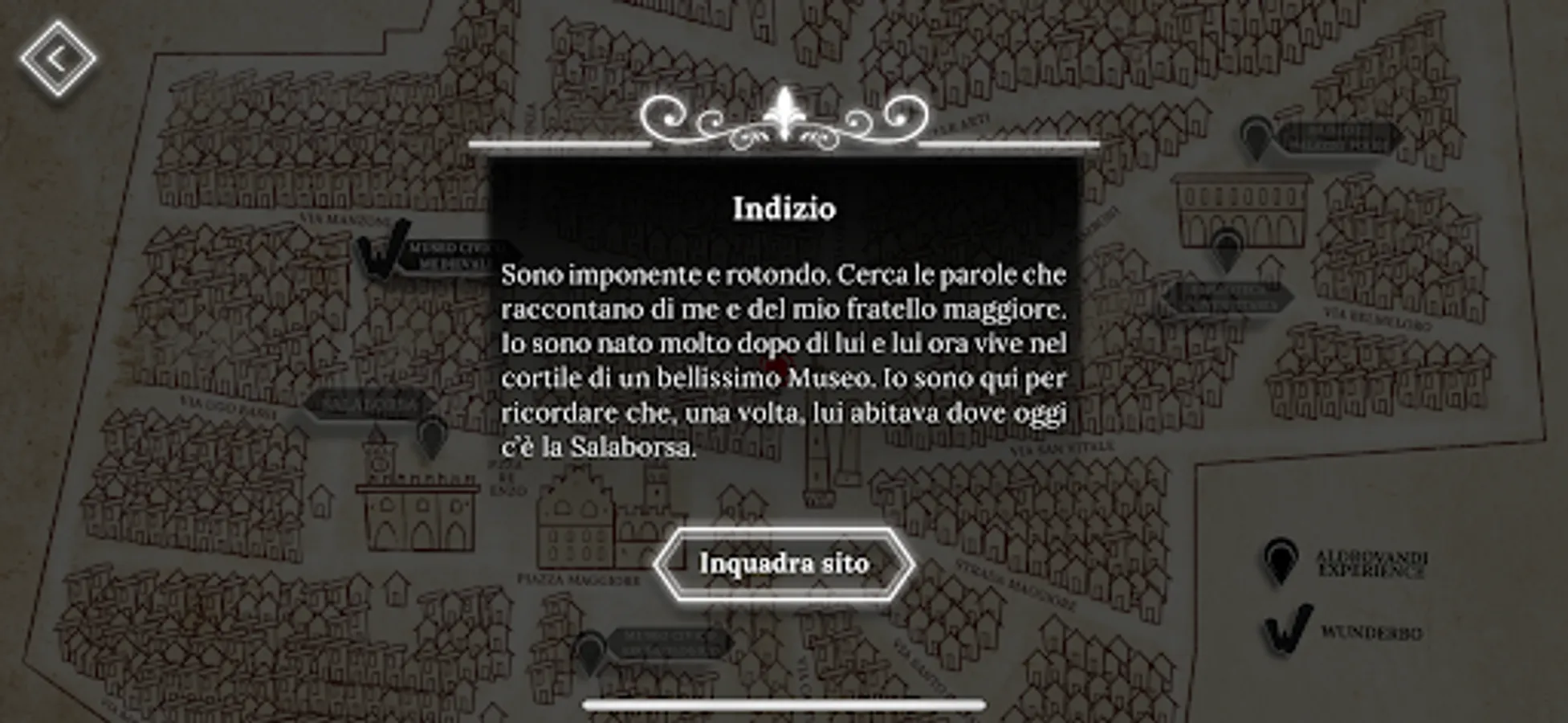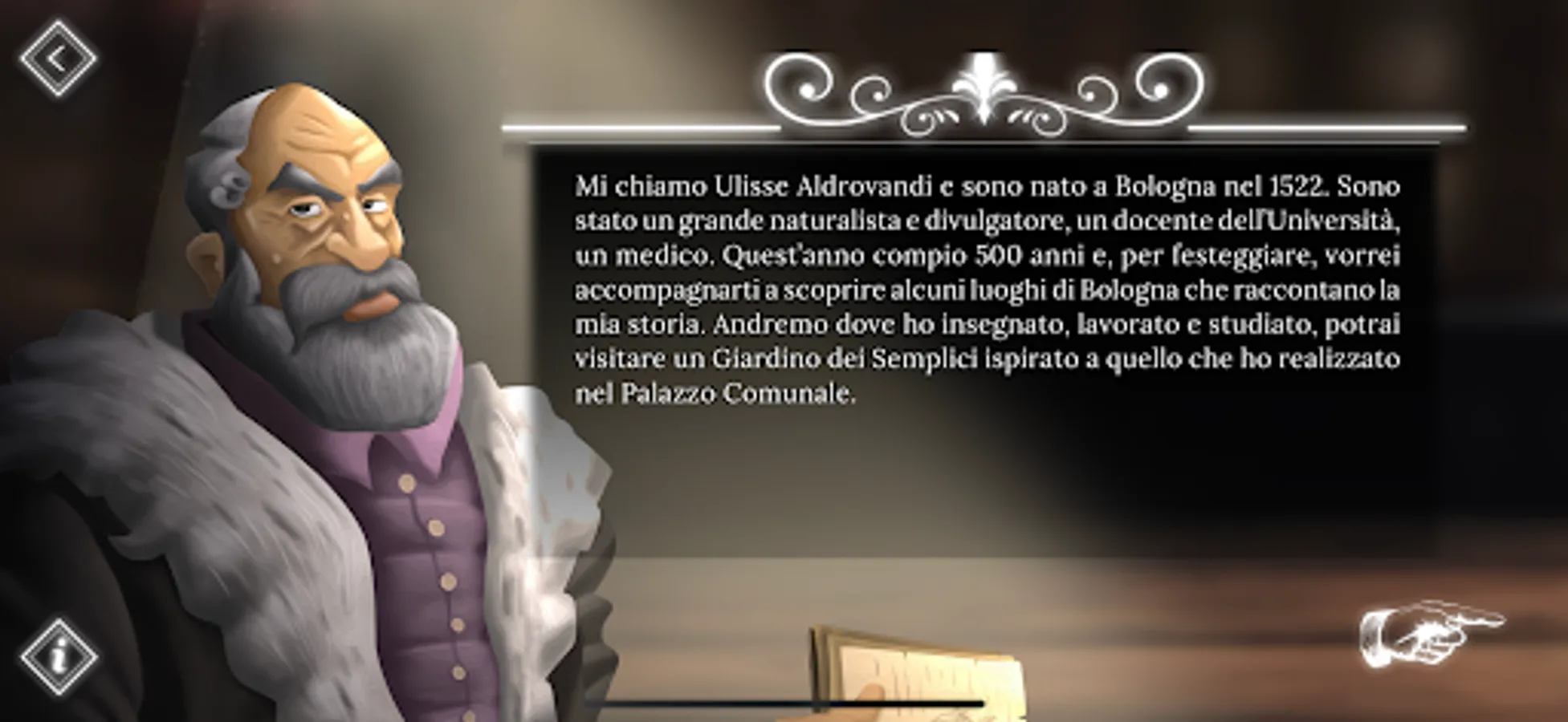 Following Ulisse Aldrovandi through a journey to discover the city, the player must find some animals or symbols taken from his illustrated books, starting in search of the reference sites and collecting them thanks to clues and indications useful for completing the journey. When the GPS detects the player in the Bologna area, a map of the center is shown and a first-person story by Ulisse Aldrovandi begins the adventure.