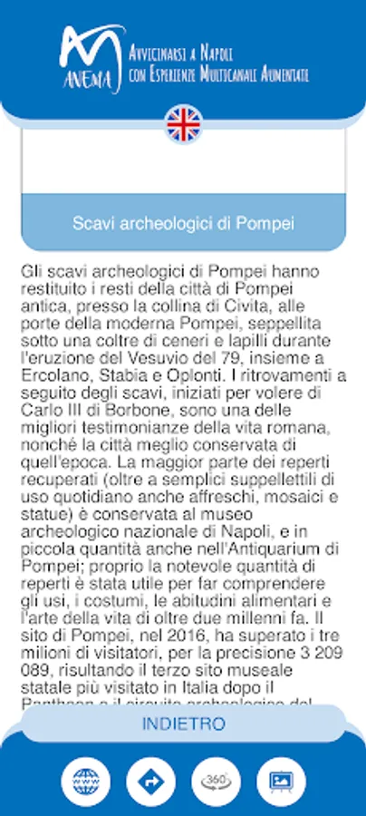 AnemApp is an application that allows you to visit Naples in a unique way thanks to personalized visit itineraries generated by Artificial Intelligence. For optimal use of the App, registration is recommended as it will help the AI understand your interests and suggest places near you, usable at that moment and above all in line with your profile. The only personal data that will be requested during registration is your e-mail address but don't worry, it will not be used for any marketing activity.
