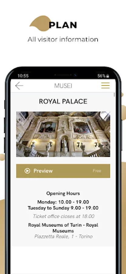 The App is multilingual (Italian and English) and provides visitor information BEFORE, DURING and AFTER their visit to the Royal Museums of Turin.