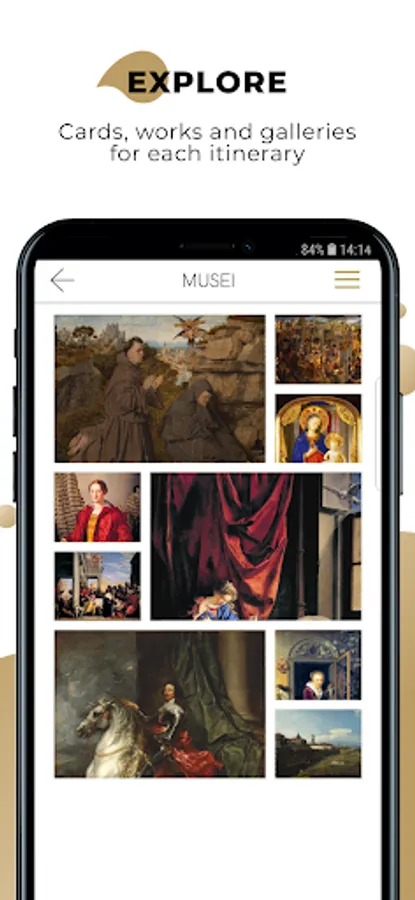 The individual itineraries feature a dedicated and recognisable graphic interface providing a comprehensive and user-friendly view of the selected itinerary. One "tap" is view the gallery of the most significant exhibits contained in the chosen environment and select them for more in-depth information.
