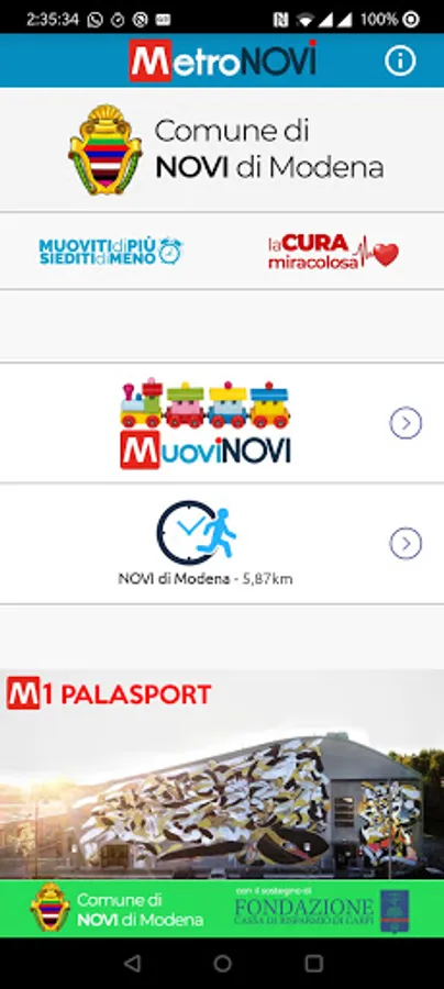 • MuoviNOVI for the physical exercise of fast walking or slow running on the pedestrian urban subway, a "life path" protected and away from busy roads traced in the capital Novi of the Municipality of Novi di Modena, in the residential and densely populated part.