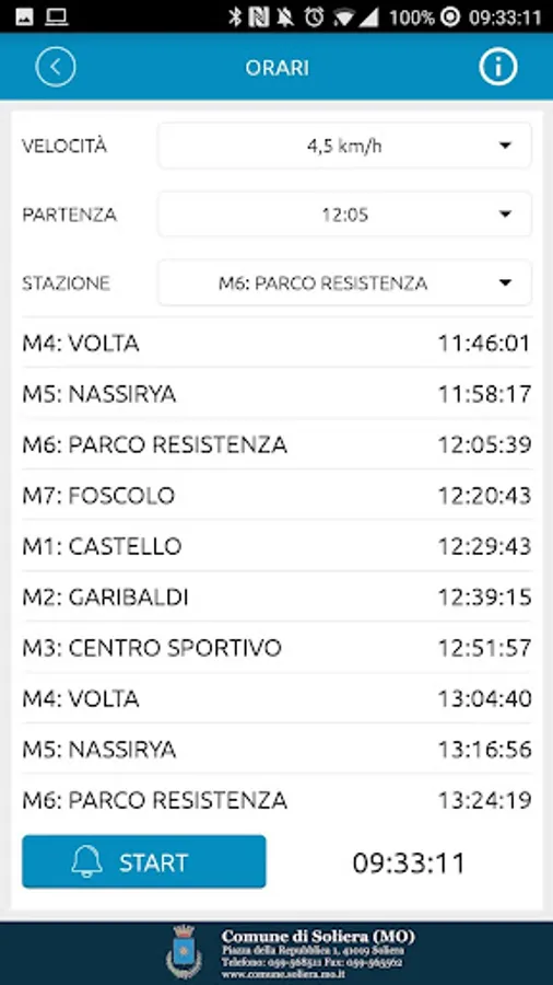 The timetable of trains, when a preset pitch velocity (4.5 to 10 km / hour) and after selecting the time and the departure station, allows the calculation of the penetration times by all subsequent stations also earlier.