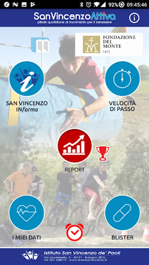 In the application there are nine sections: banner - SAN VINCENZO informs - step speed - my data - blister - report - Prize - alarms.