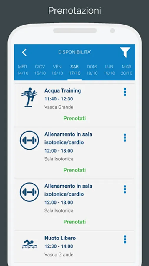 - The sports center can optionally limit reservations to a maximum number of seats and activate the management of waiting lists. Any user present in the first position on the waiting list will automatically receive a notification in the event that another booked user should cancel their reservation.
